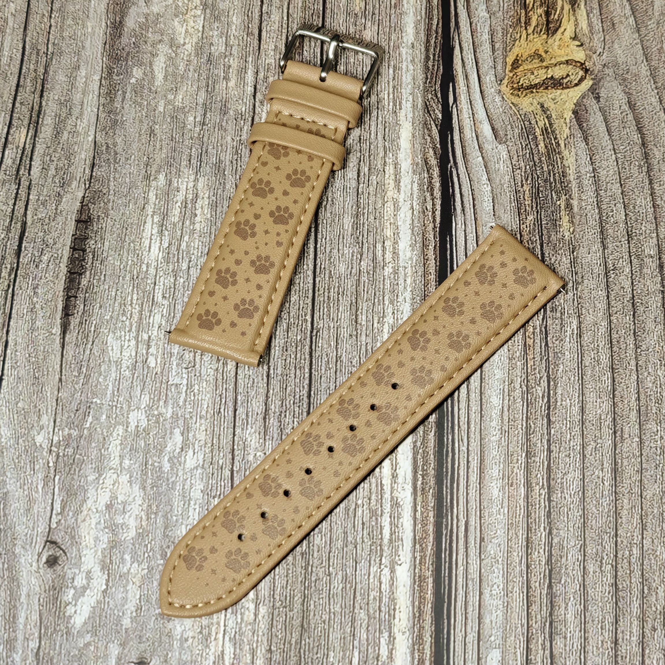 3COINSのスマートウォッチ「デバイスバンド」用の交換バンド「フェイクレザーバンドステッチ」のベージュに猫の足跡(肉球)柄を入れてみました。他の柄や、別カラー(2026年2月時点ではグレー)、バンドへの加工もお問い合わせください。自分だけのオンリーワンバンドを作りませんか?