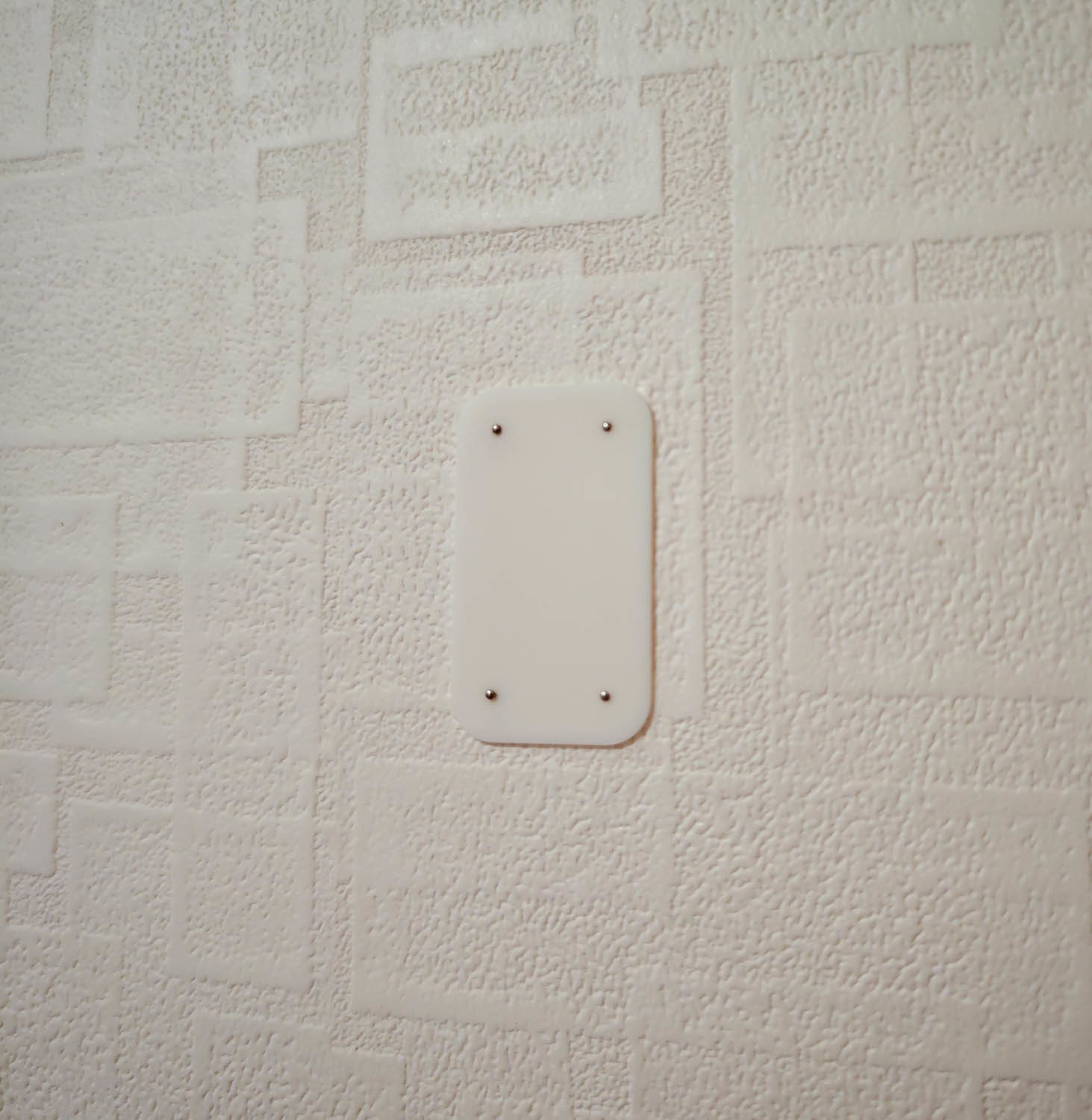 VALLHORNのバックプレートはネジか両面テープで壁に固定する想定ですが、壁紙にダメージを与えずに取り付けたい場合、本品が便利です。1mm弱の虫ピンx4本で壁に固定し、その上にVALLHORN付属の両面テープでバックプレートを貼り付けます。虫ピンはとても細いので、取り外し後の壁に空く穴が極小で済みます。市販の穴埋め補修材で簡単に隠せます。