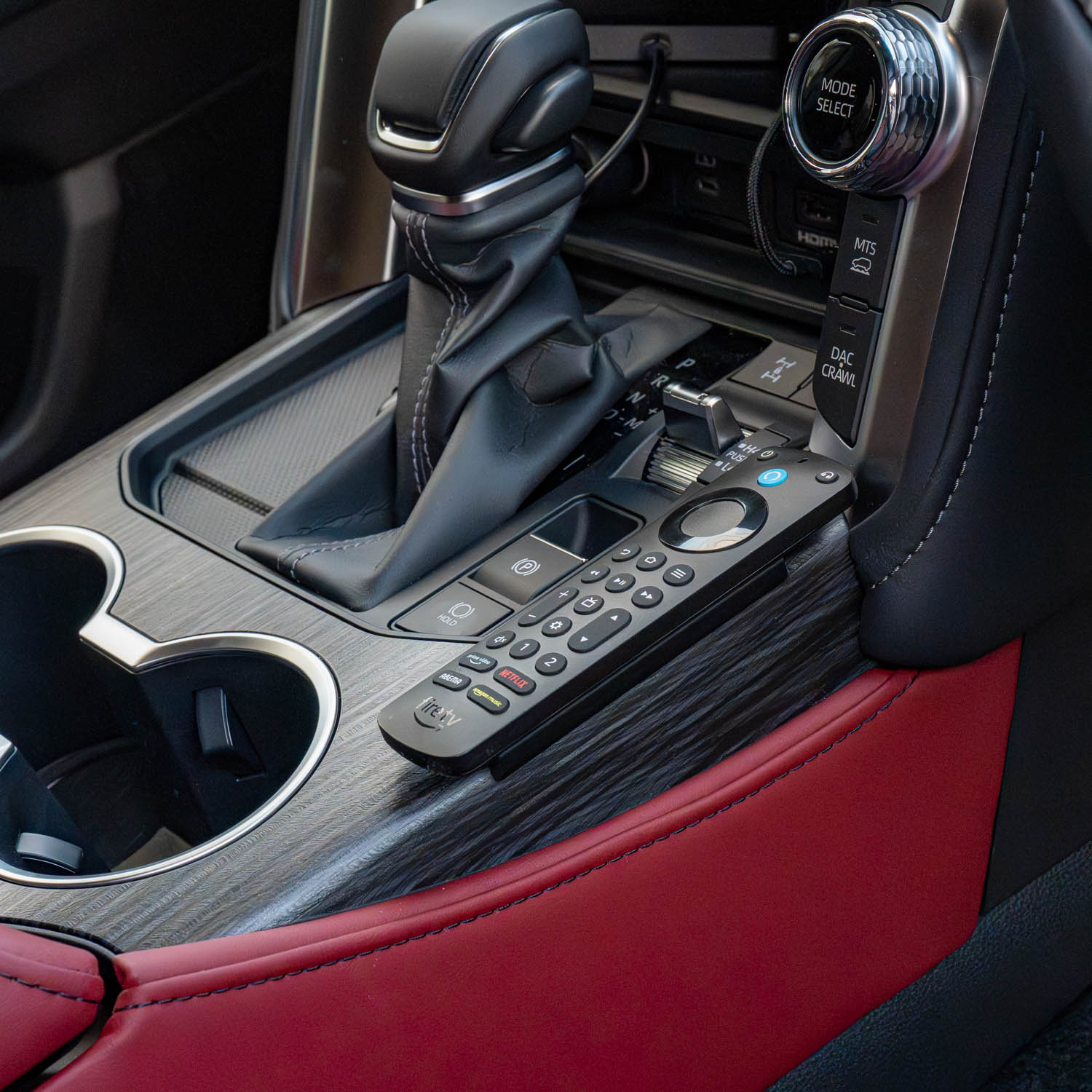 ランクル300のシフトレバー脇にFireTV Stick等のリモコンを固定するためのホルダーです。