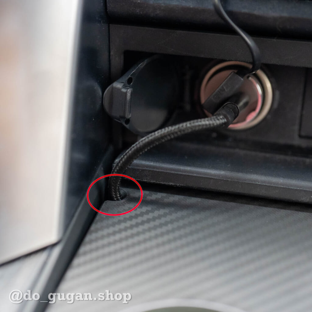 ケーブルはUSB/HDMIポートやアクセサリソケットのあるパネルのフタにギリギリ干渉しない位置に開けました。下の写真のように最短距離でアクセサリーソケットに装着したUSBポートに差し込むだけです。