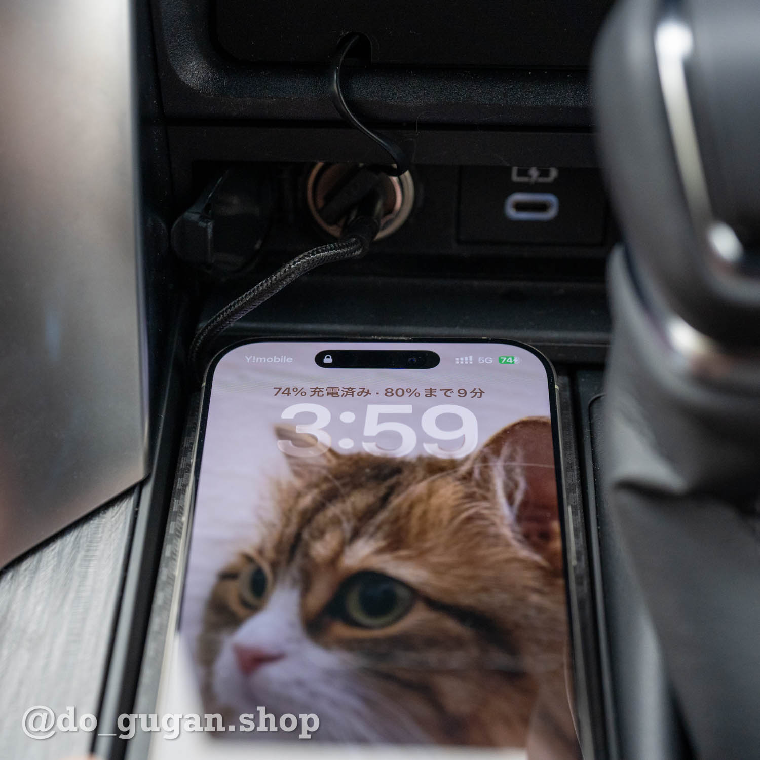 LC-MC10用にアクセサリソケットにつけるUSB充電器はPD 30W以上を使うように指示されているので、元々使っていたこちらでテストしています。USB Aポート側にも別の機器を接続するとCポート出力が30Wでないので、低速充電になってしまいます。Qi2/15W充電したい場合は、単独使用するか、もっと出力の大きな充電器が必要になります。