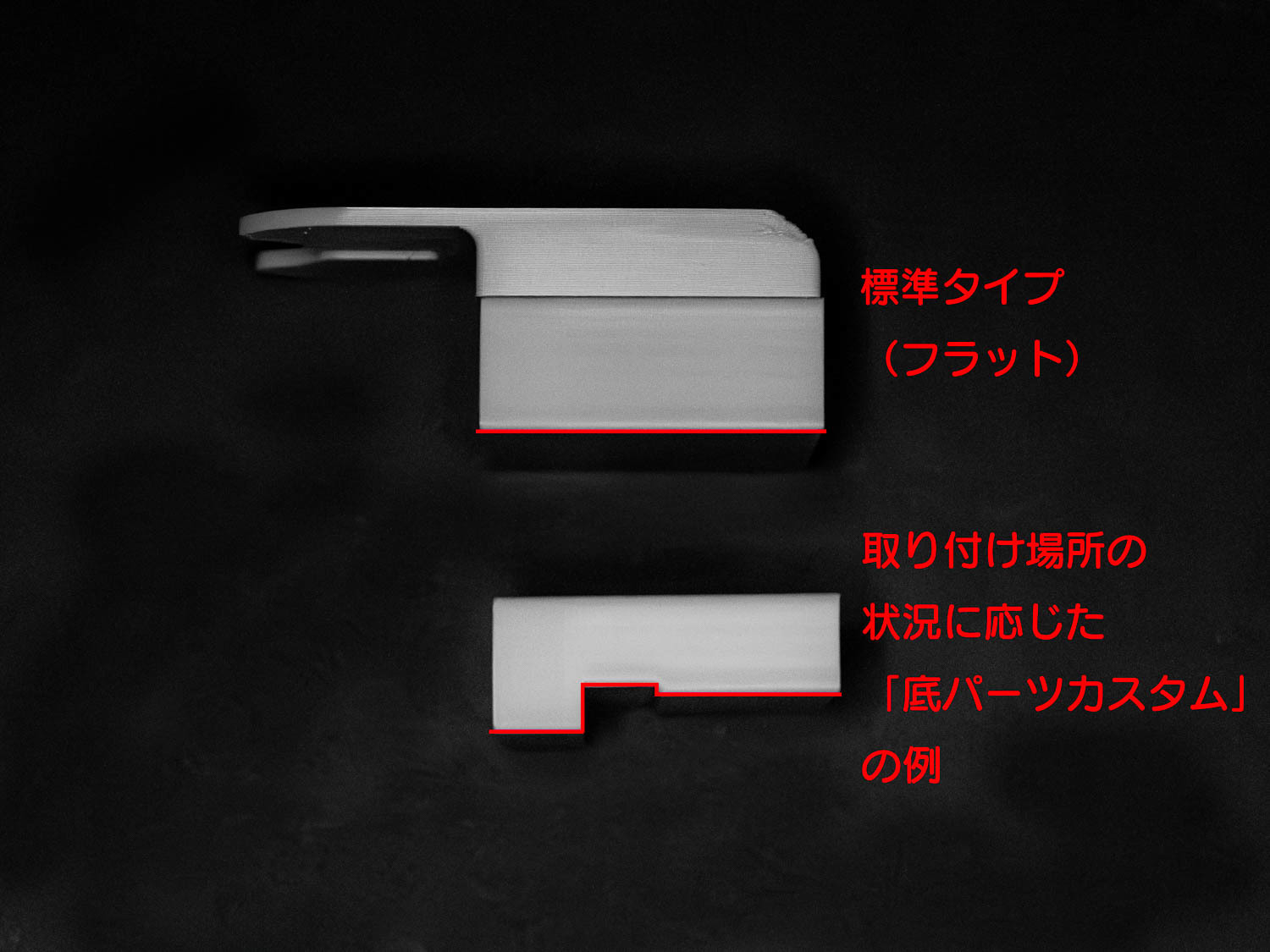 サンプル写真のように取付面に段差があったり、高さ(壁からの距離)が変わっている場合は「底パーツカスタム」にて対応します。注文前に現況がわかる写真やサイズ情報を添えてお問い合わせください。対応可否をお答えさせていただきます。